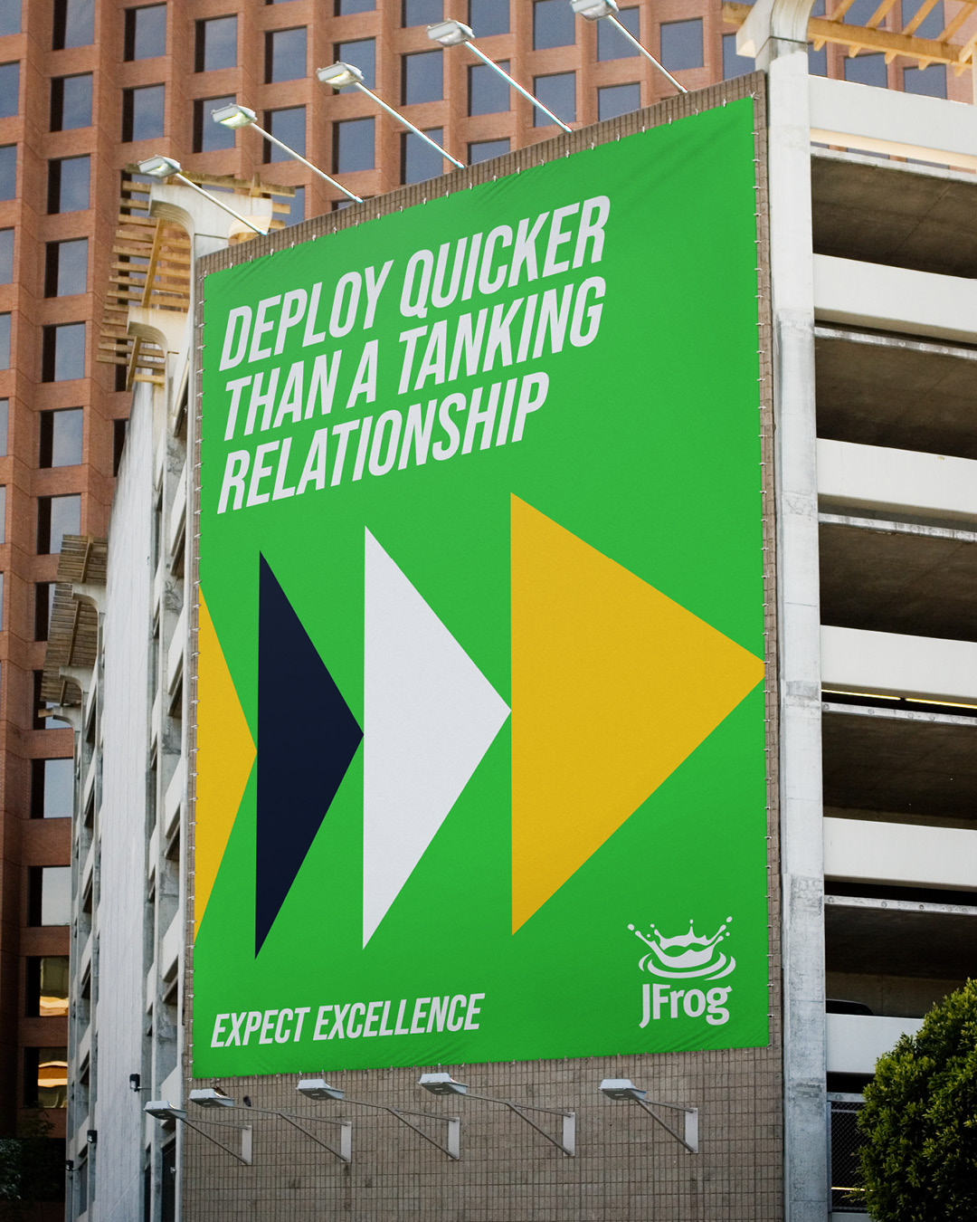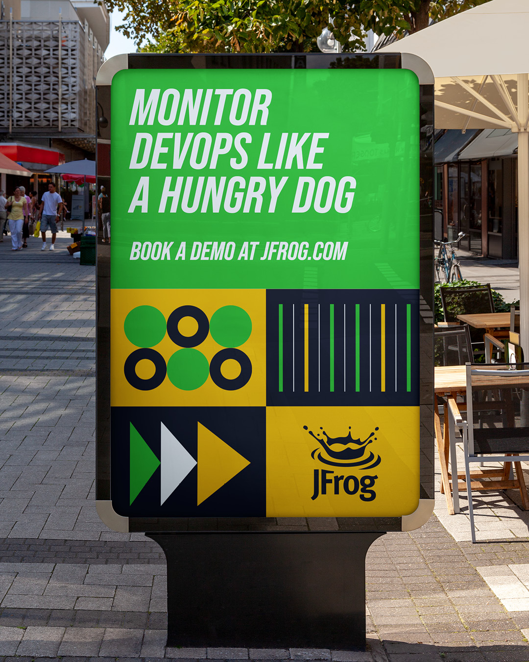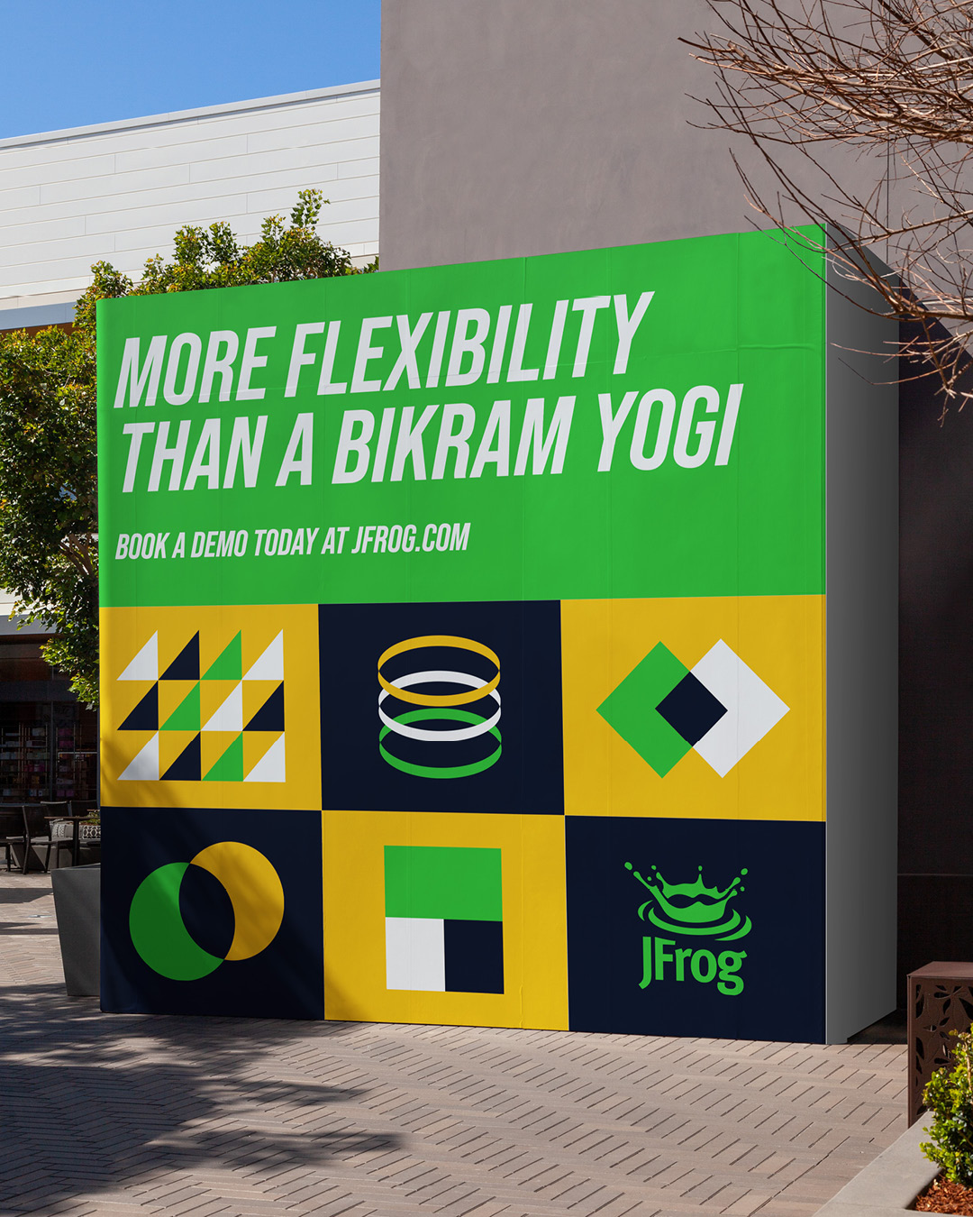 The campaign strategy, customer-centric and digital-first, guided all creative assets to align with JFrog’s brand. A unique, shape-based design system unified product visuals for brand consistency and recognition. Beyond digital, specialized event placements like OOH and parking garage takeovers maximized reach and impact.
