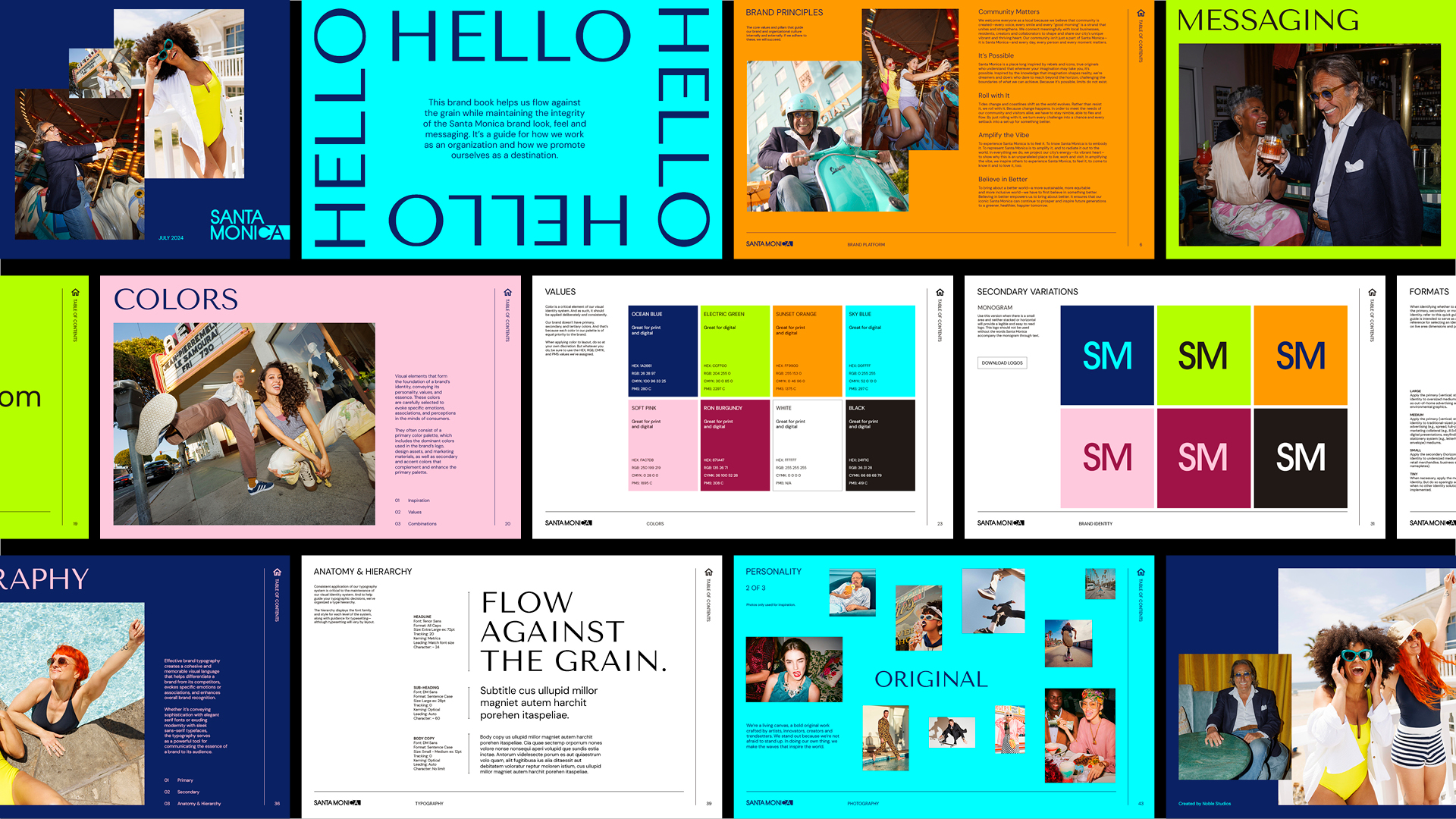 The brand identity was developed to unify Santa Monica’s visual and verbal expression under a clear, cohesive system that reflects its modern spirit. Its purpose was to move beyond traditional beach-town imagery and instead highlight the city’s blend of creativity, sophistication, and authenticity. Through bold colors, expressive typography, and a confident tone, the identity captures Santa Monica’s energy and establishes it as a destination that’s both timeless and forward-thinking.